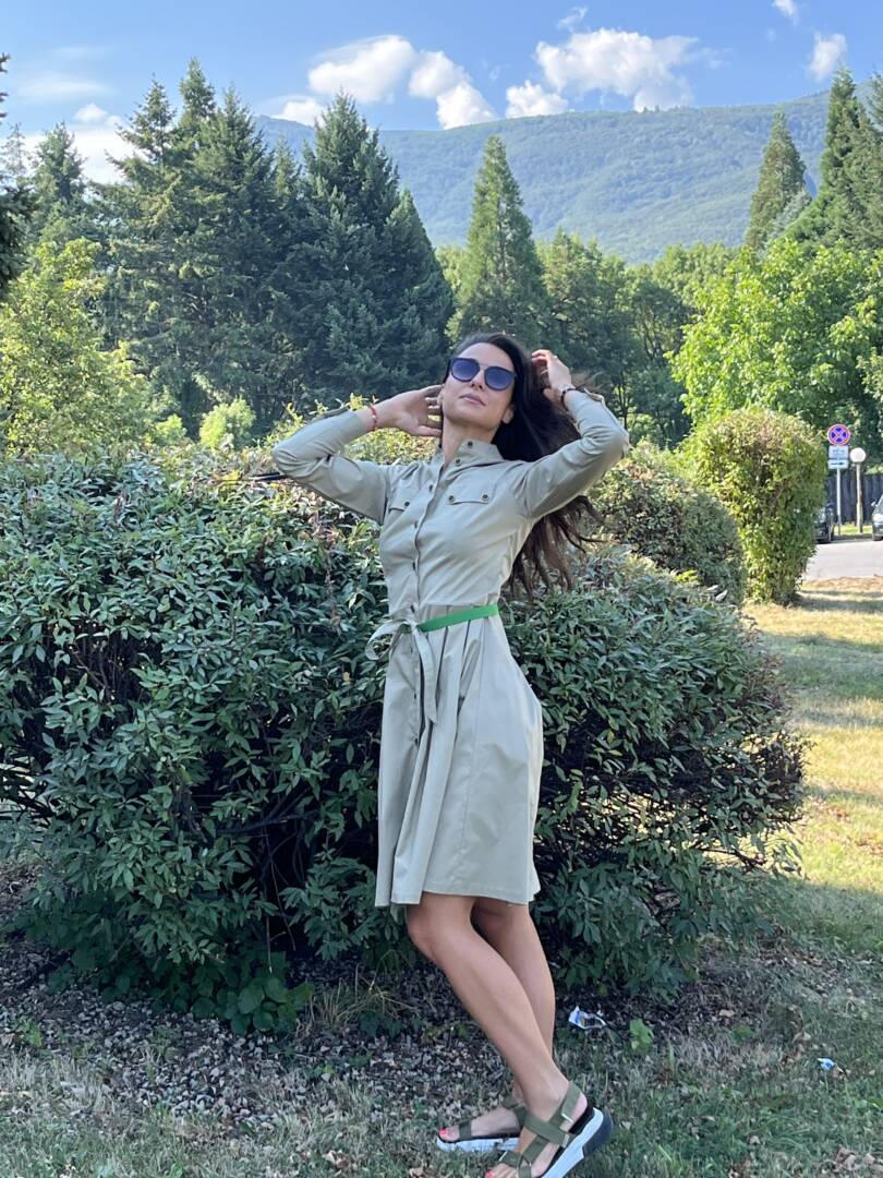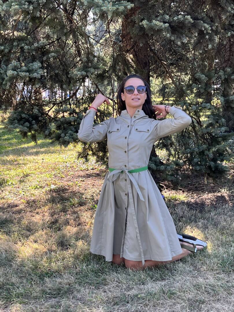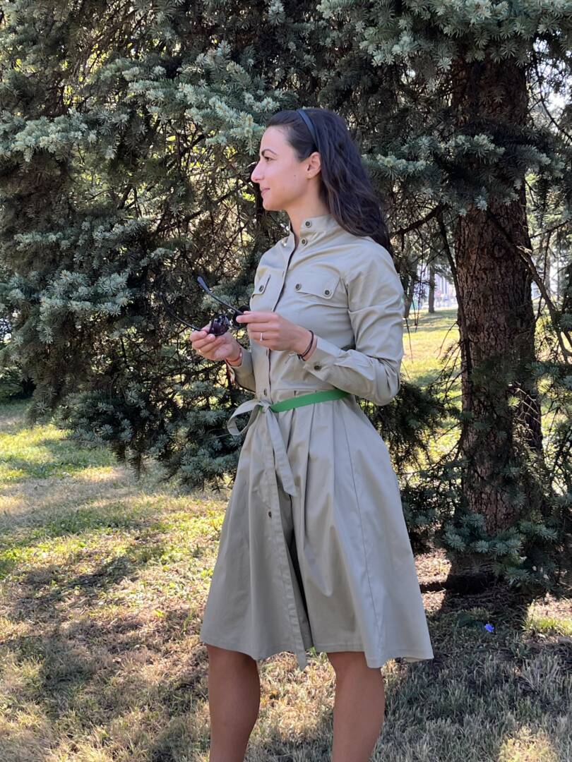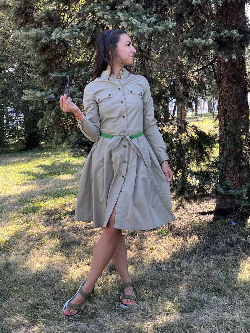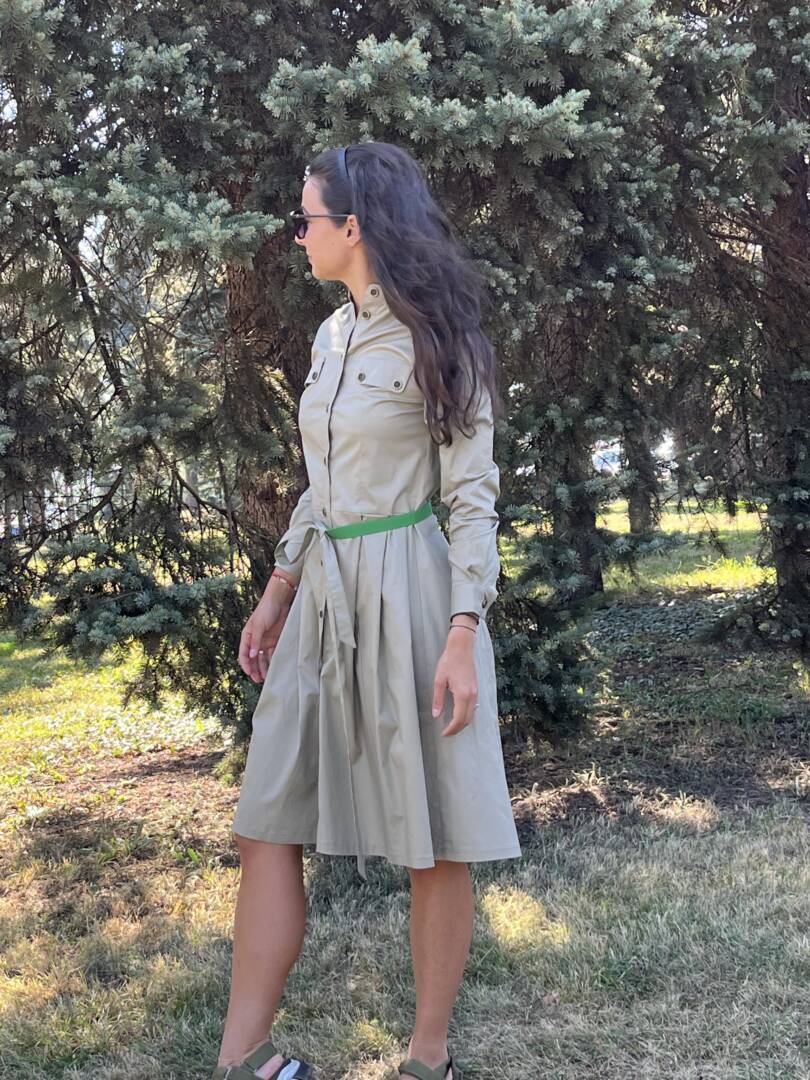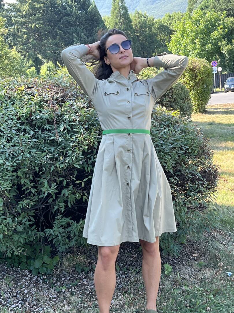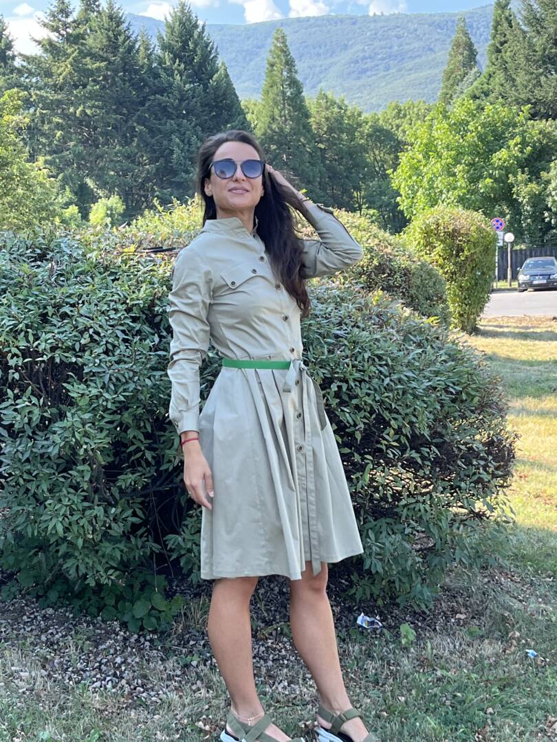 Dress shirt with belt. Sporty-elegant beige dress with long sleeves and cuffs. Dress with detachable green belt. Full length fastening. Made of fabric 95% cotton and 5% elastane. Perfectly combined with low or high shoes and sneakers. A great dress for warm fall days and evenings. Suitable for the city and leisure time or for the office. Material composition cotton, polyester and elastane. It is also made to an individual size. Just send us your measurements and you will have this lovely dress. We select the fabrics with a lot of love and attention. We want our customers to feel great in their clothes. We produce quality garments for sustainable fashion.