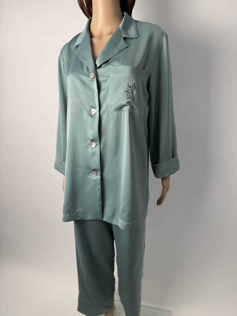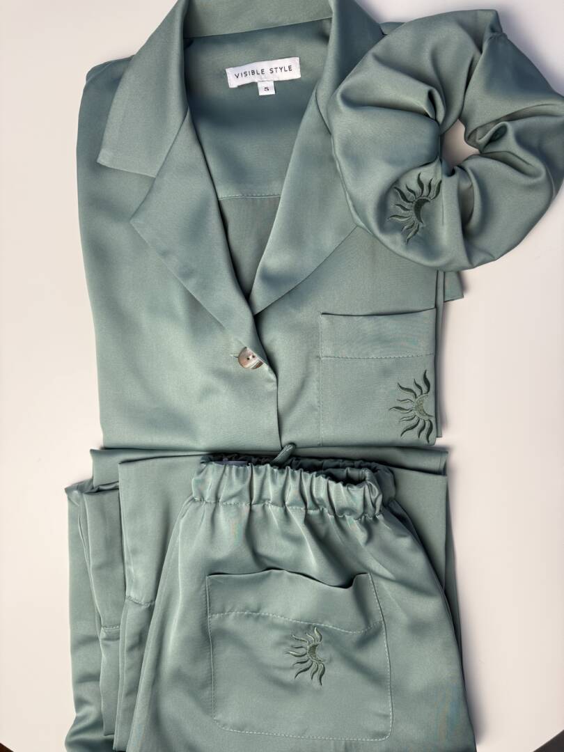 This exclusive pajama set is part of a special collection, featuring a custom embroidered logo created uniquely for the series — a stylized moon embraced by a half sun, symbolizing balance, calm, and refined femininity.
