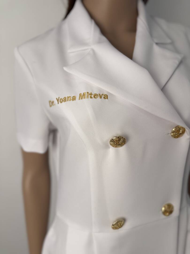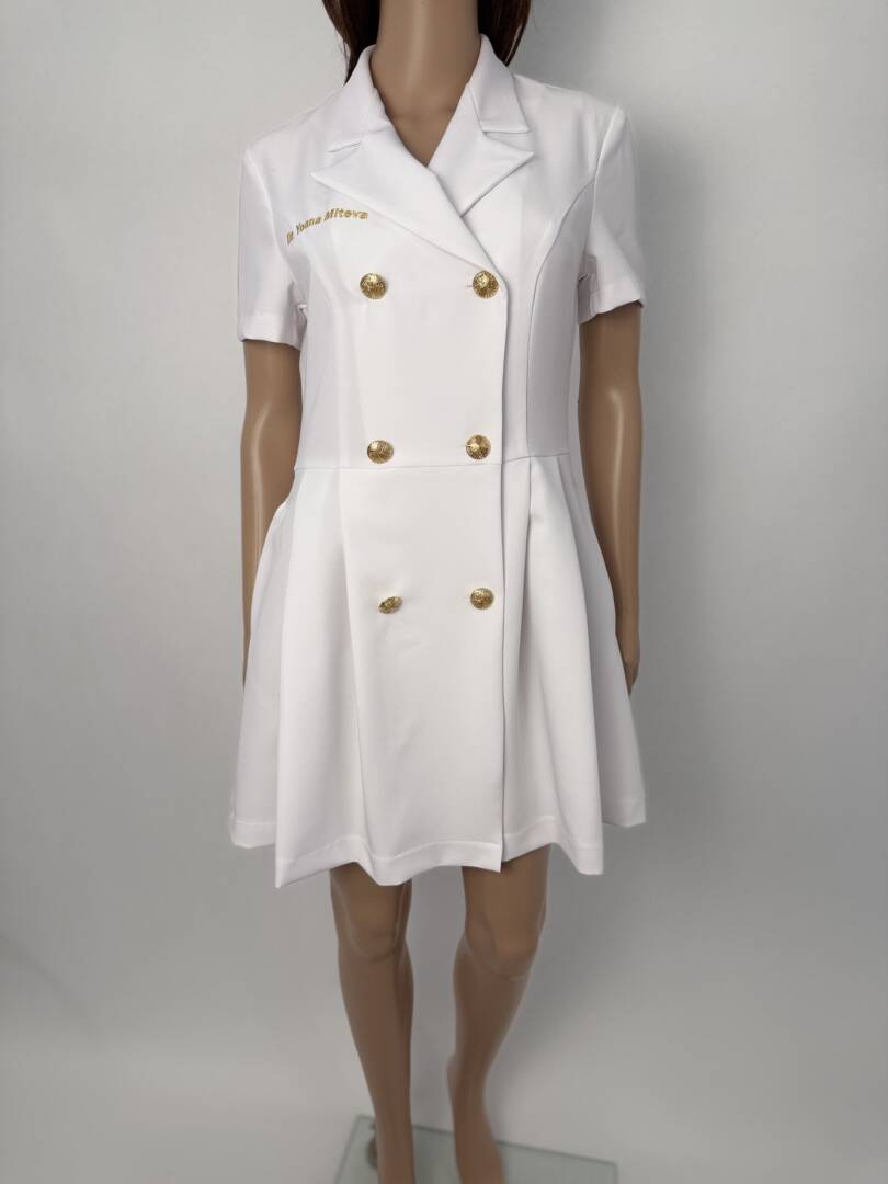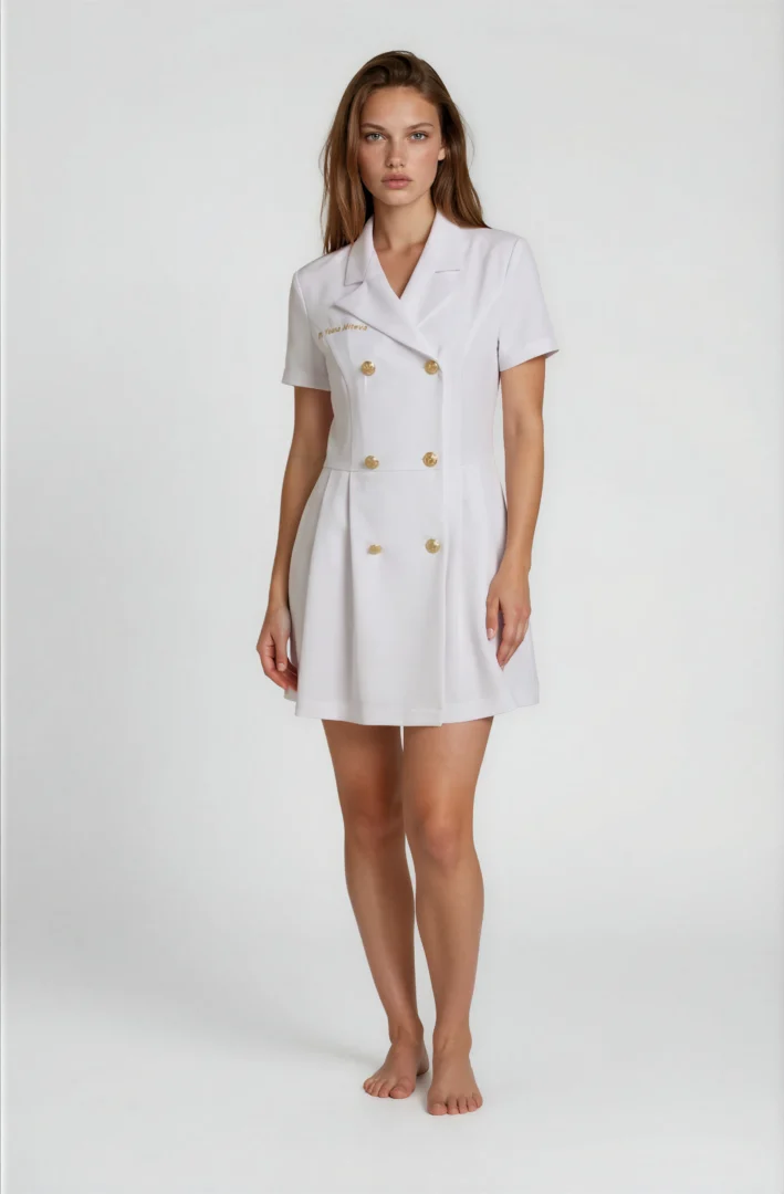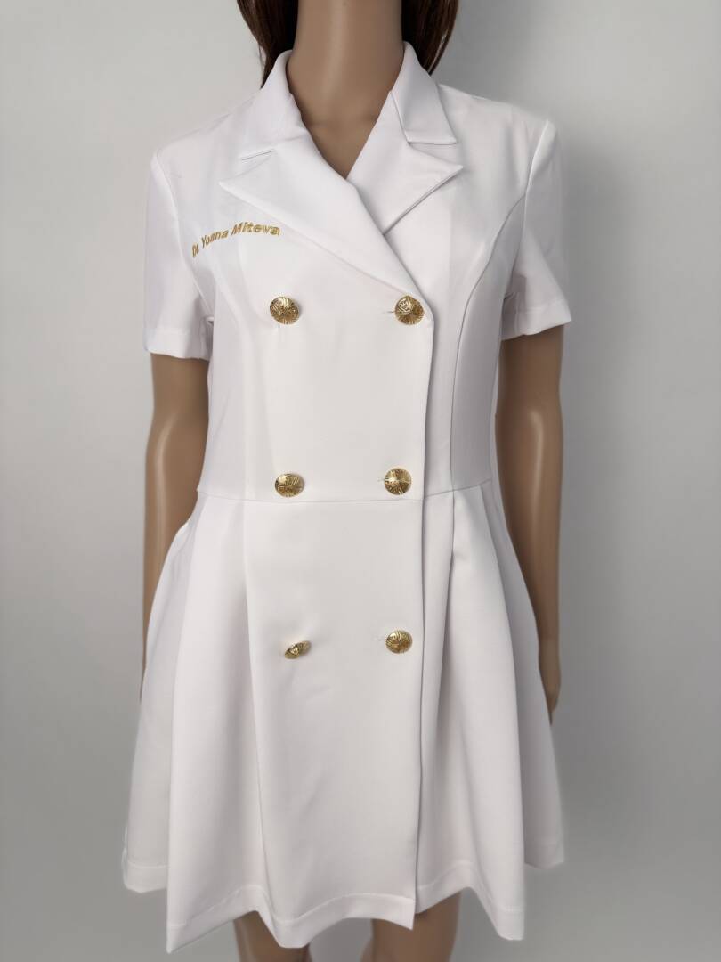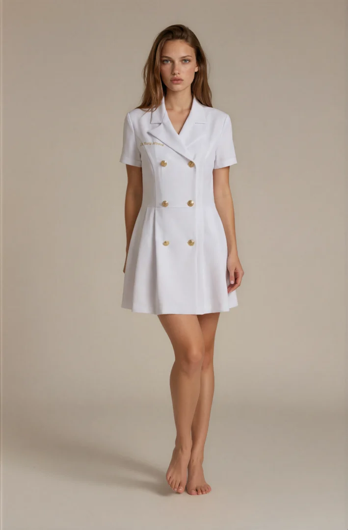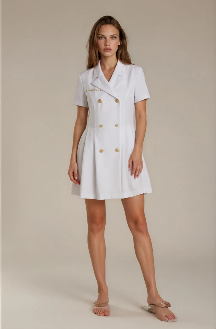 This premium dress is ideal for dermatologists, beauty salons, laser centers, and aesthetic clinics. Its tailored silhouette and luxurious fabric combine functionality with timeless design.