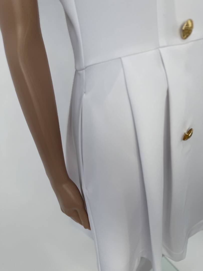 Elegant Design: Flared bottom, short sleeves, lapel collar, and double-breasted closure with gold buttons.