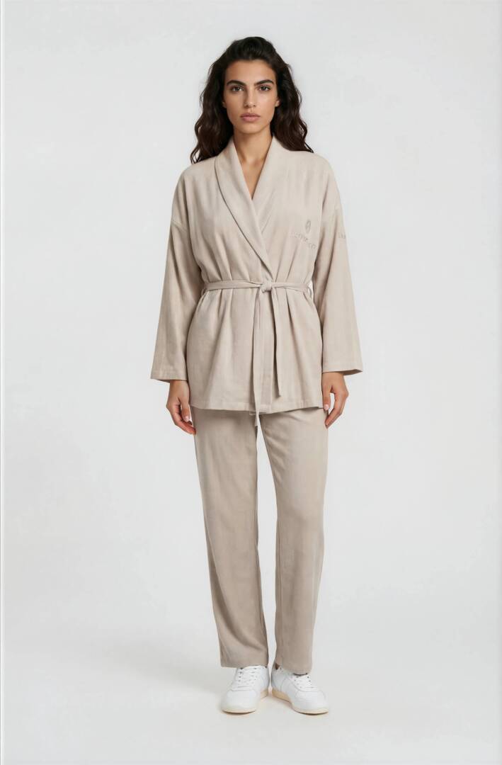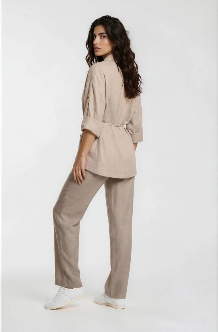 The top is loose with a drawstring on the inside and a hidden button on the outside, The thin belt emphasizes the waist. The sleeve rolls up and fastens with a button for convenience. The pants have a straight cut, elastic waist and drawstring, and have two pockets. This luxury set has a clean and elegant design.