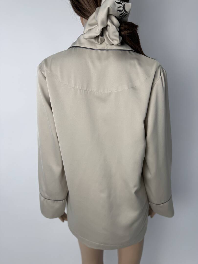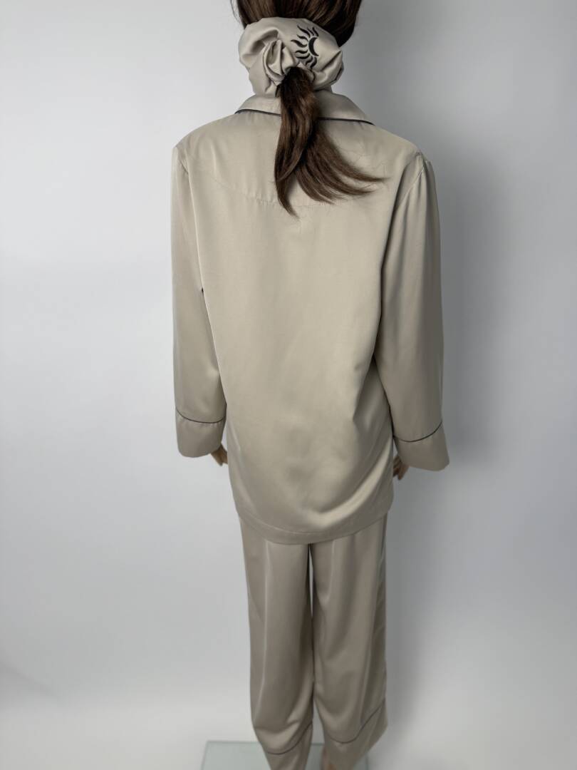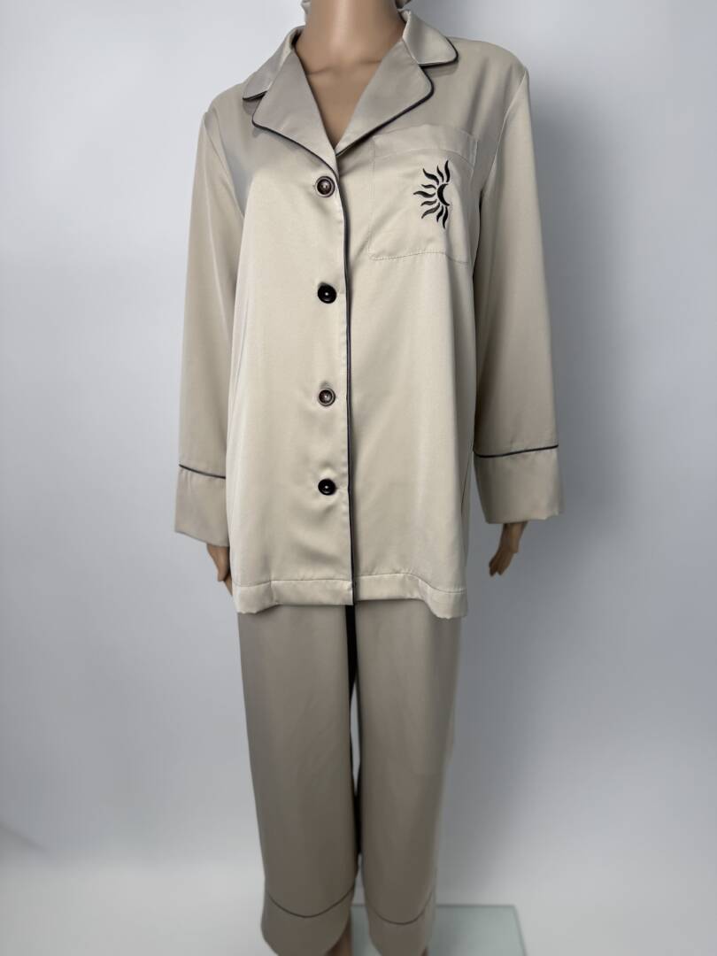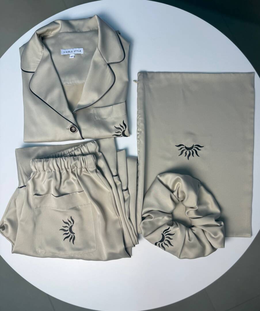 *** For USA, we ship with DDP and there are no additional fees for you.   Luxury Satin Pajama Set with Embroidered Moon & Sun Logo | Handmade Premium Satin Sleepwear | Satin Pajamas with Scrunchie & Storage Bag Immerse yourself in timeless elegance with this luxurious, handmade satin pajama set, crafted from high-quality, ultra-soft satin, designed to feel silky smooth on the skin. This exclusive pajama set is part of a special collection featuring a custom embroidered logo created uniquely for the series – a stylized moon embraced by a half-sun, symbolizing balance, tranquility and refined femininity. ✨ Set includes: Long-sleeved satin pajama top with embroidered chest pocket Long satin pants in matching color with pocket Embroidered satin hair tie Elegant satin storage bag with embroidery Each garment is finished with delicate contrasting piping, adding a sophisticated, couture-inspired detail. The logo is carefully embroidered in a contrasting color on: Pajama top pocket Pant pocket Satin hair tie Storage pouch 🪡 Handcrafted with exceptional attention to detail, this pajama set reflects true craftsmanship, from the precise stitching to the flawless embroidery. The high-quality satin offers luxurious drape, a soft touch and long-lasting quality, making it ideal for both a restful sleep and elegant lounging. Perfect as: Luxury nightgown set A sophisticated gift for a bride or honeymoon A premium gift for self-care A stylish gift for someone special Created for women who value comfort without compromise, this satin pajama set combines luxury, softness and craftsmanship in every detail. Key Features High-quality satin fabric Ultra soft, smooth and breathable Handmade Custom embroidered moon and sun logo Contrast piping for a luxurious finish Full set of accessories Elegant, timeless design
