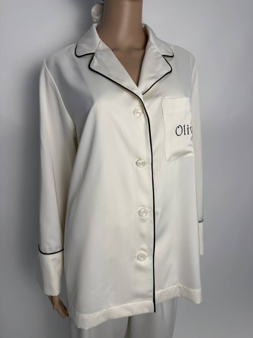 *** For USA, we ship with DDP and there are no additional fees for you.   Luxury Satin Pajama Set with Embroidered Moon and Sun Logo | Handmade Premium Satin Pajama Set | Satin Pajama Set with Elastic Band and Storage Bag Immerse yourself in timeless elegance with this luxurious, handmade satin pajama set of top and pants, crafted from high-quality, ultra-soft satin, designed to feel silky smooth on the skin. This exclusive pajama set is part of a special collection that comes with a personalized name embroidery, perfect for a personal or wedding gift. ✨ Set includes: Satin pajama top with long sleeves and embroidered chest pocket Coordinated long satin pants with pocket Embroidered satin hair tie Elegant satin storage bag with embroidery Each garment is finished with delicate contrasting piping, adding a sophisticated, couture-inspired detail. The logo is carefully embroidered in a contrasting color on: Top pocket of the pyjama Satin hair tie Storage pouch 🪡 Handcrafted with exceptional attention to detail, this pajama set reflects true craftsmanship, from the precise stitching to the impeccable embroidery. The high-quality satin offers luxurious drape, a soft touch and long-lasting quality, making it ideal for both a restful sleep and elegant lazing around. Perfect as: Luxury nightgown set A sophisticated gift for a bride or honeymoon A premium gift for self-care A stylish gift for someone special Created for women who value comfort without compromise, this satin pajama set combines luxury, softness and craftsmanship in every detail. Key features: High quality satin fabric Ultra soft, smooth and breathable Handmade Custom embroidered with name Contrast edging for a luxurious finish Full set of accessories Elegant, timeless design Composition and care: Fabric composition 100% polyester, soft and delicate Wash at 40 degrees Celsius Delicate spin