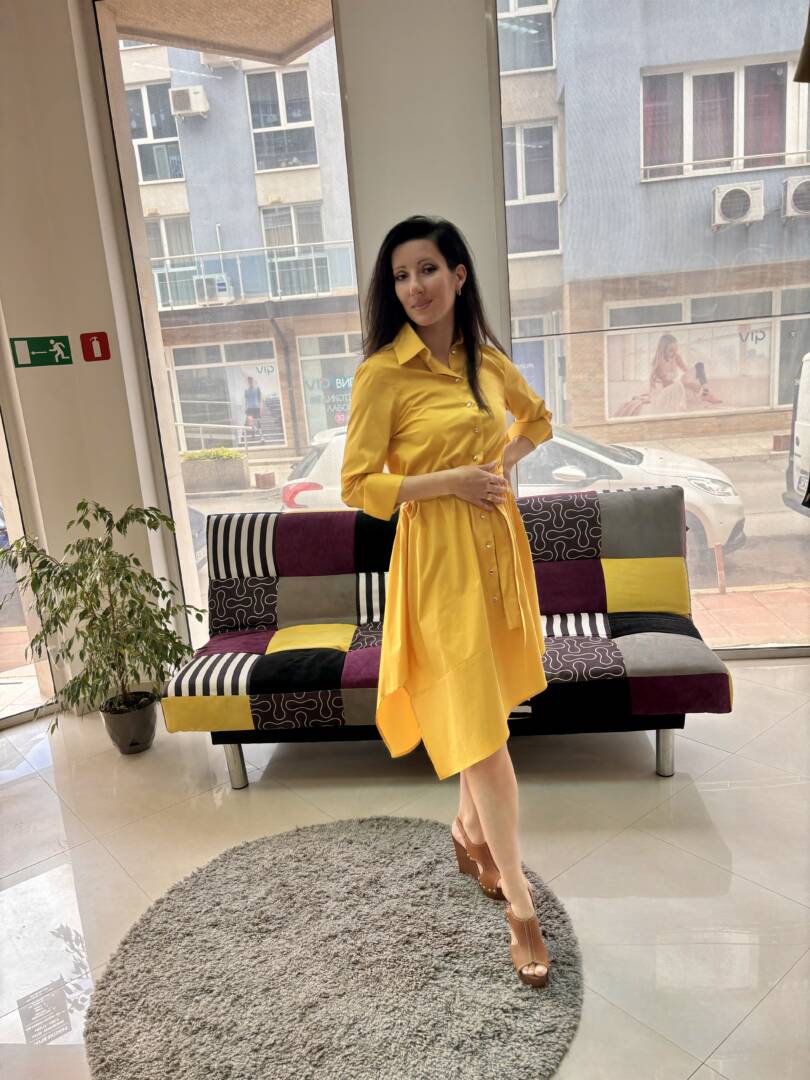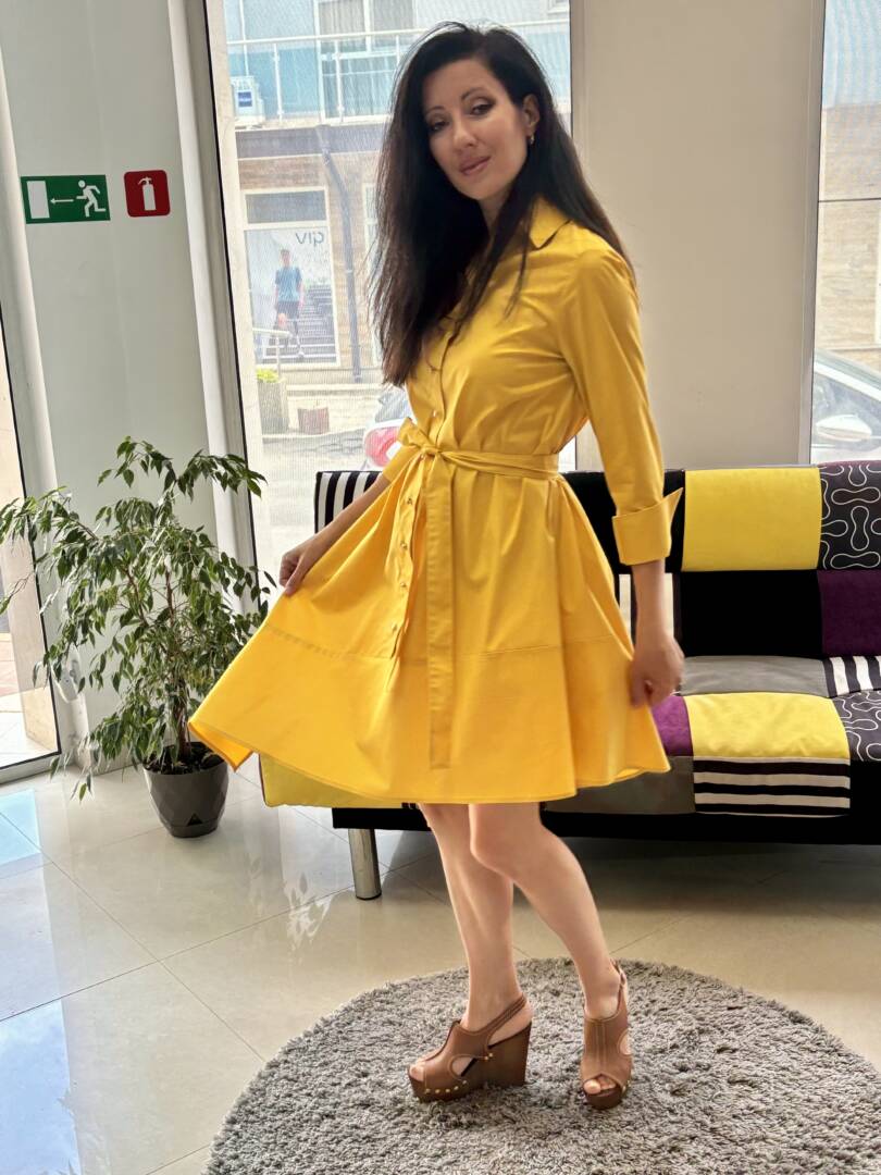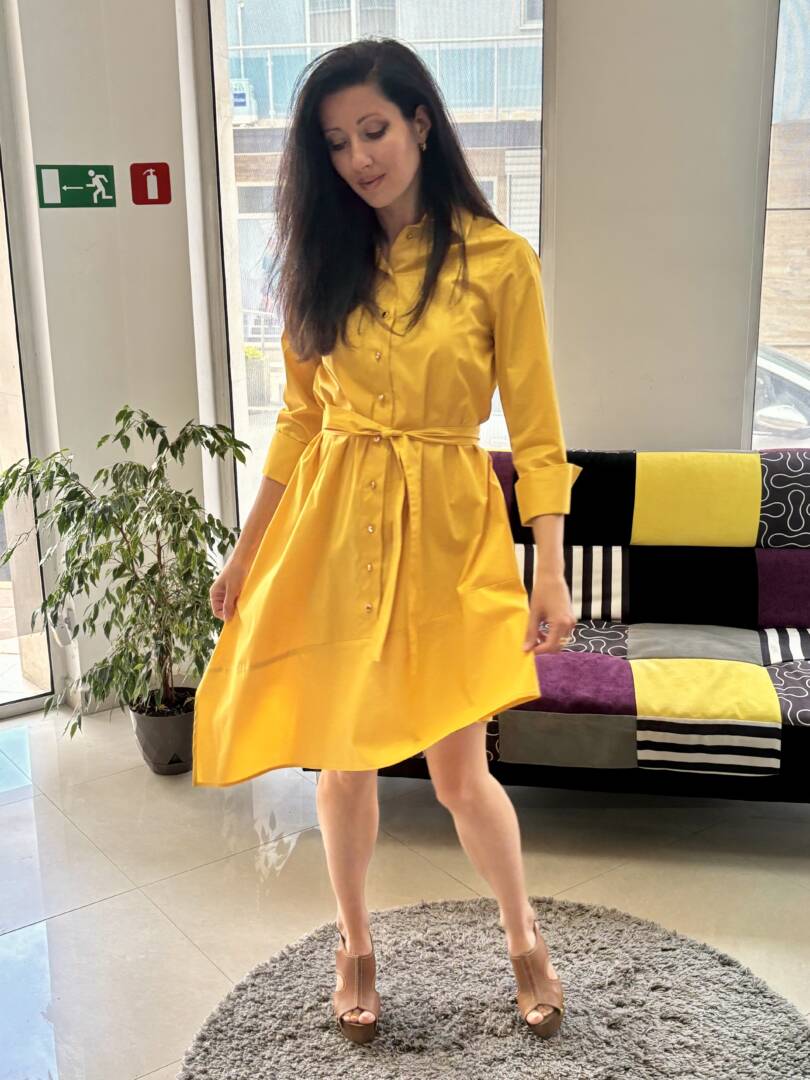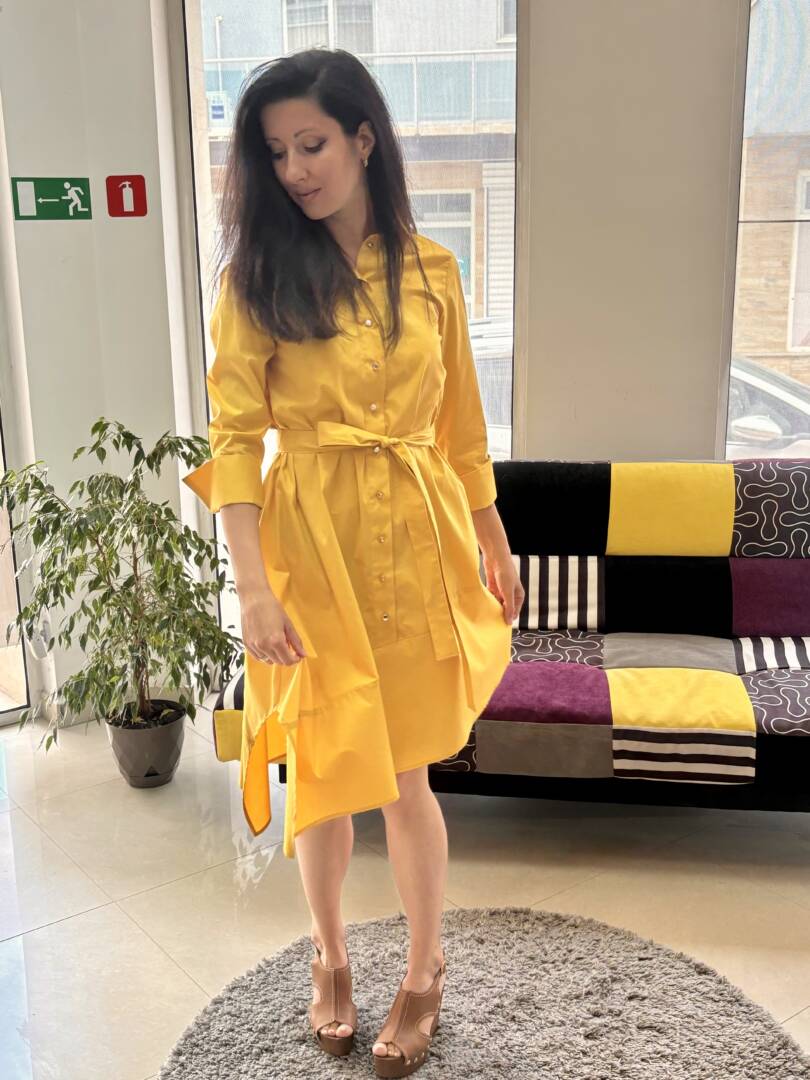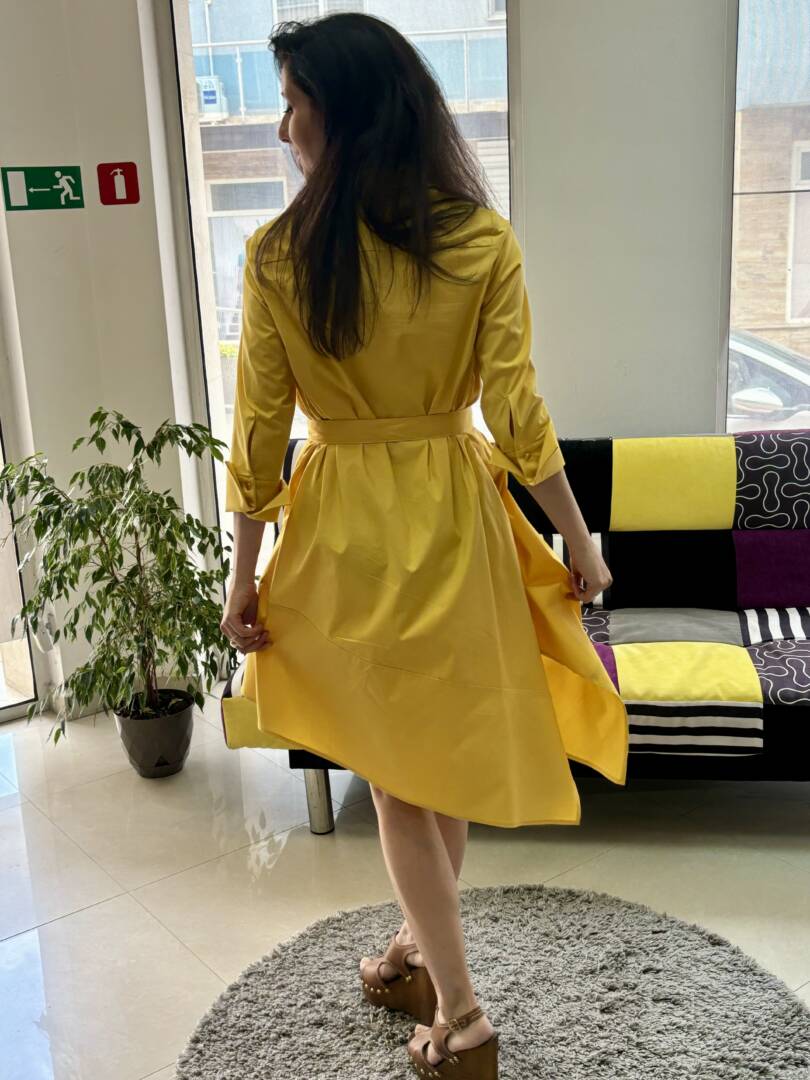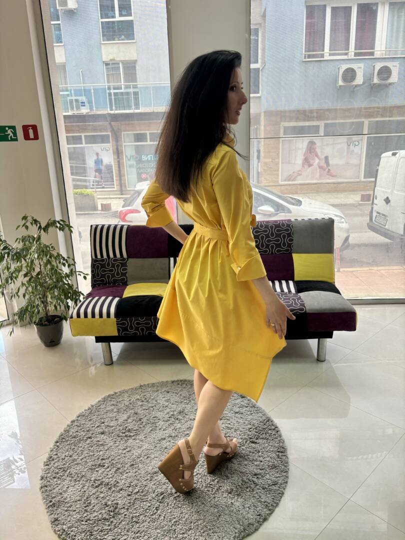 Shirt with a loose A silhouette and 3/4 sleeves with cuffs in a pleasant and modern mustard color. There is a removable belt to accentuate the waist. A comfortable dress for leisure and the city. Light and pleasant cotton fabric. It can be combined with elegant shoes or sneakers. Material composition cotton, polyester and elastane.